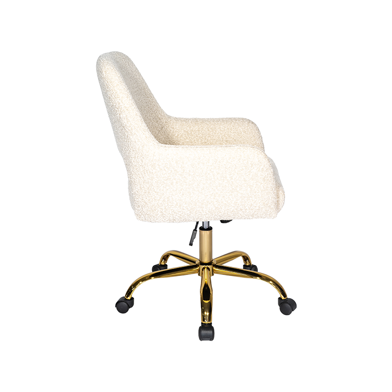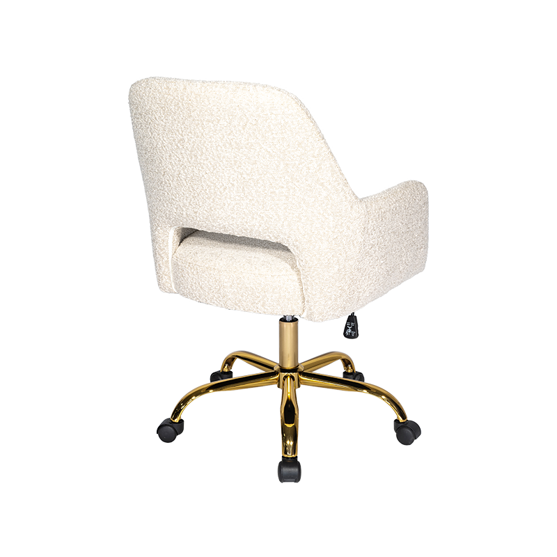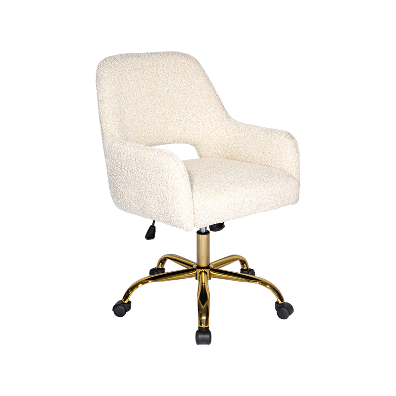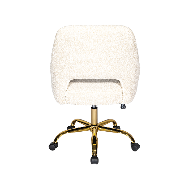 Ito White plush makeup chair Nagtatampok ng 24K electroplated gintong mga binti, makinis na gulong na gulong, at pagsasaayos ng taas ng ergonomiko. Perpekto para sa mga salon, studio, o glam home office.